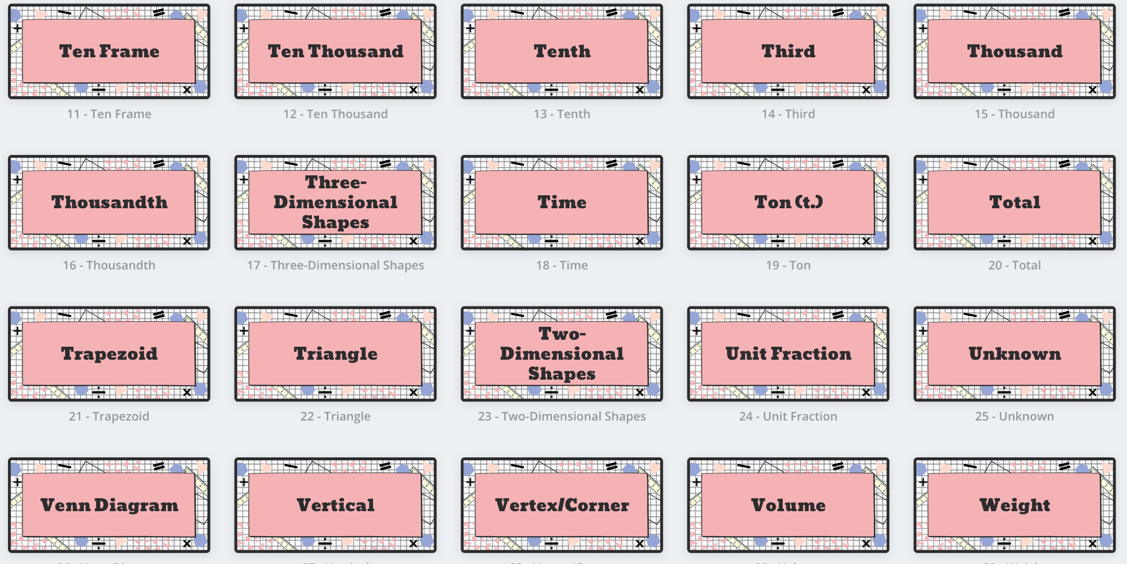 Each card has the same math theme design to keep class decor aesthetically pleasing to the eye.